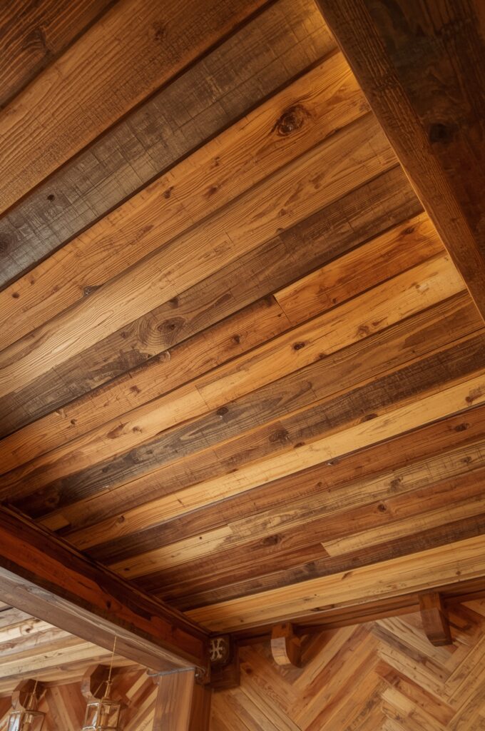 Upcycling wooden pallets into ceiling coverings.
