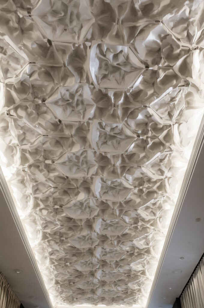Textured or 3D ceilings with modern materials create visual intrigue.