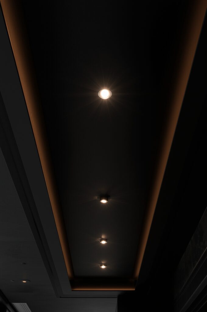 A bold black ceiling with minimal spotlights exudes drama and elegance.