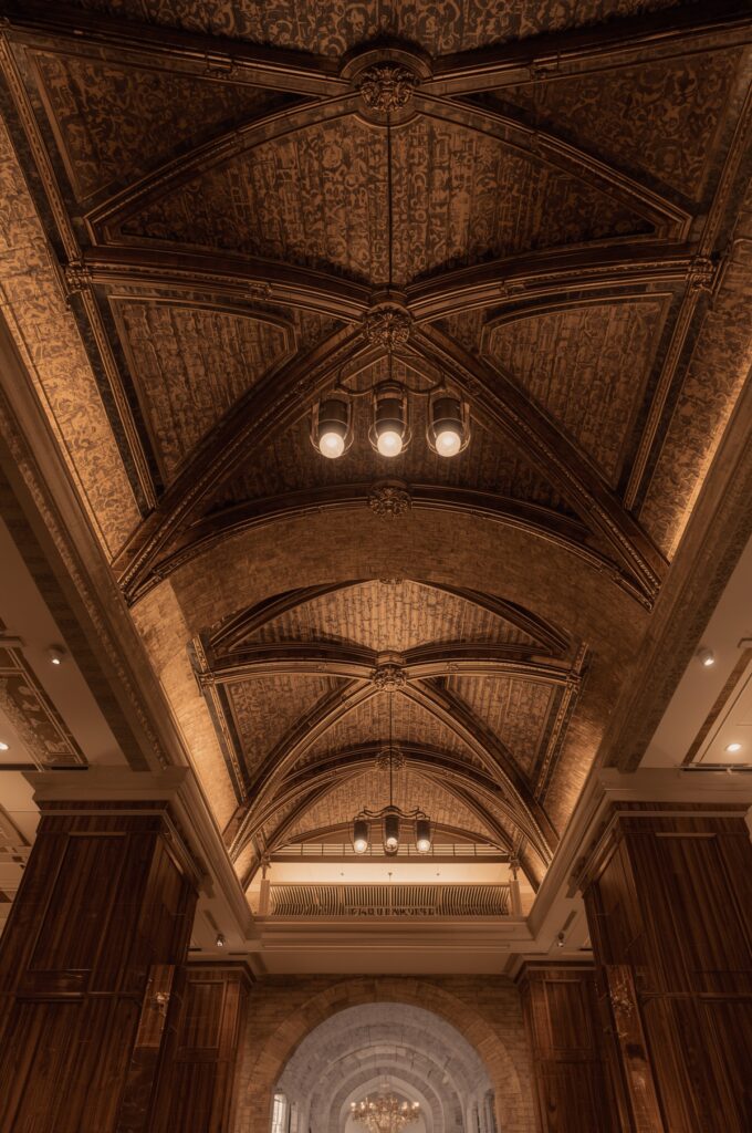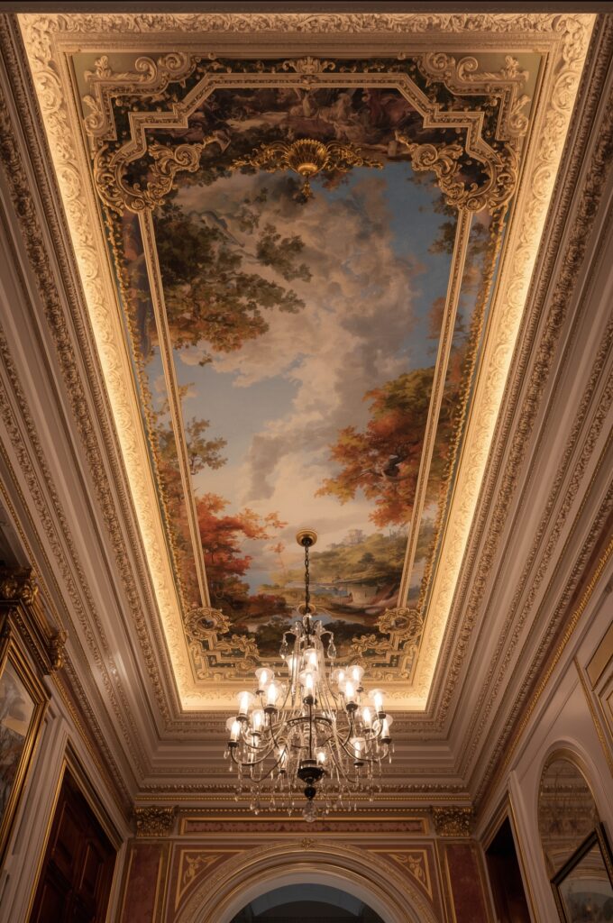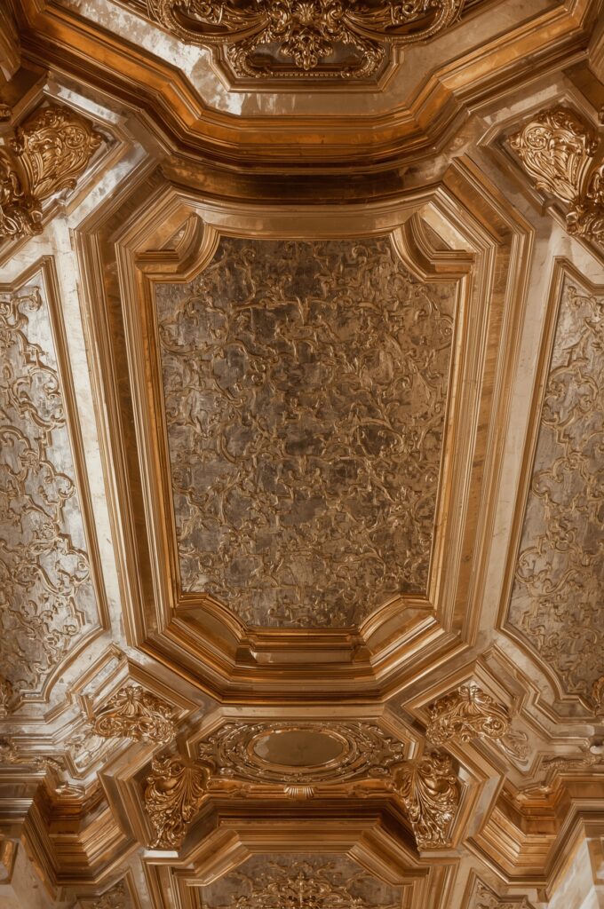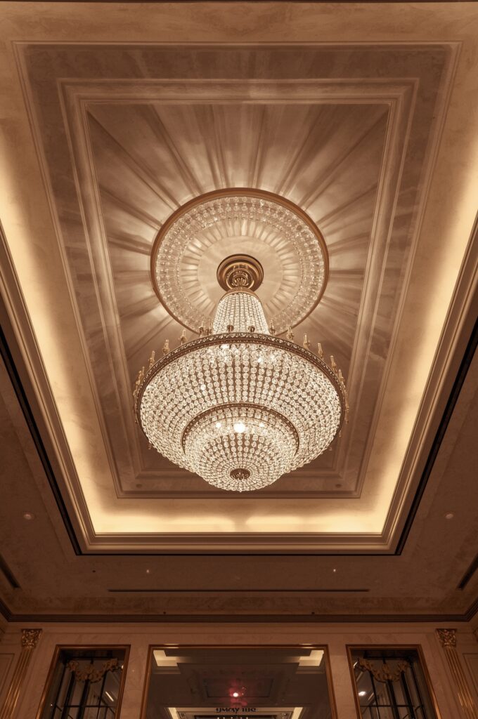 Gold, bronze, or silver finishes bring a regal touch to the ceiling.