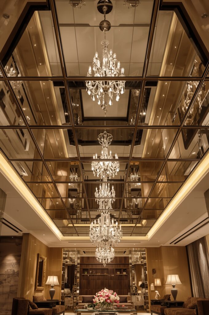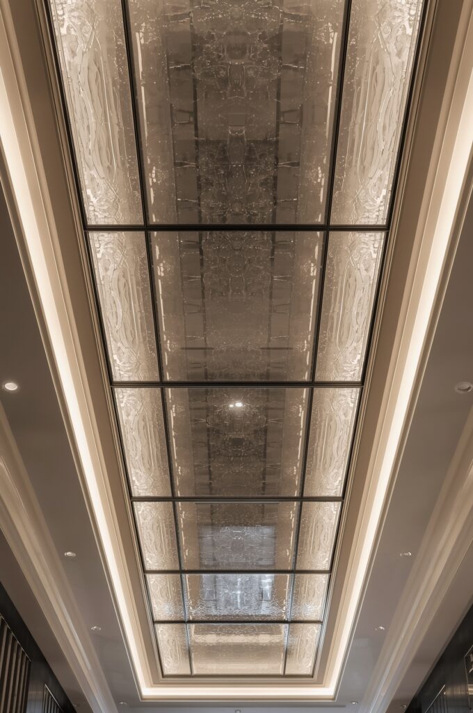 Glass panels in a false ceiling reflect light beautifully and feel ultra-modern.