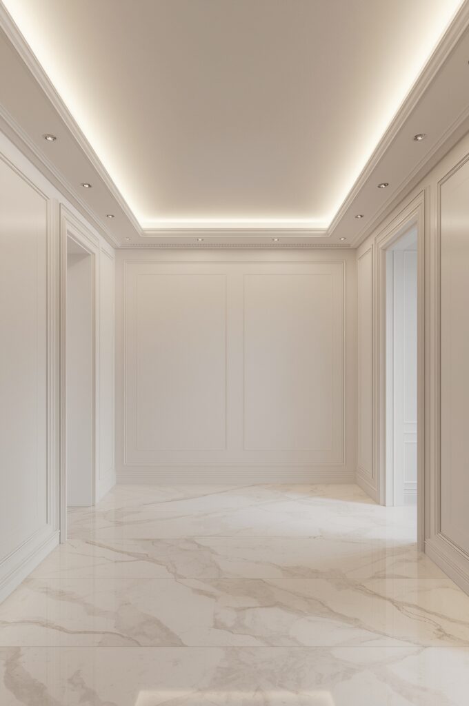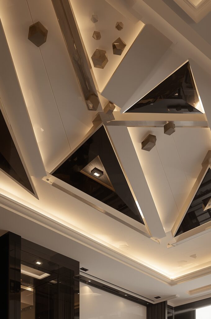 Inspired by 5-star hotels, these designs often use recessed lighting, layered panels, and premium materials.