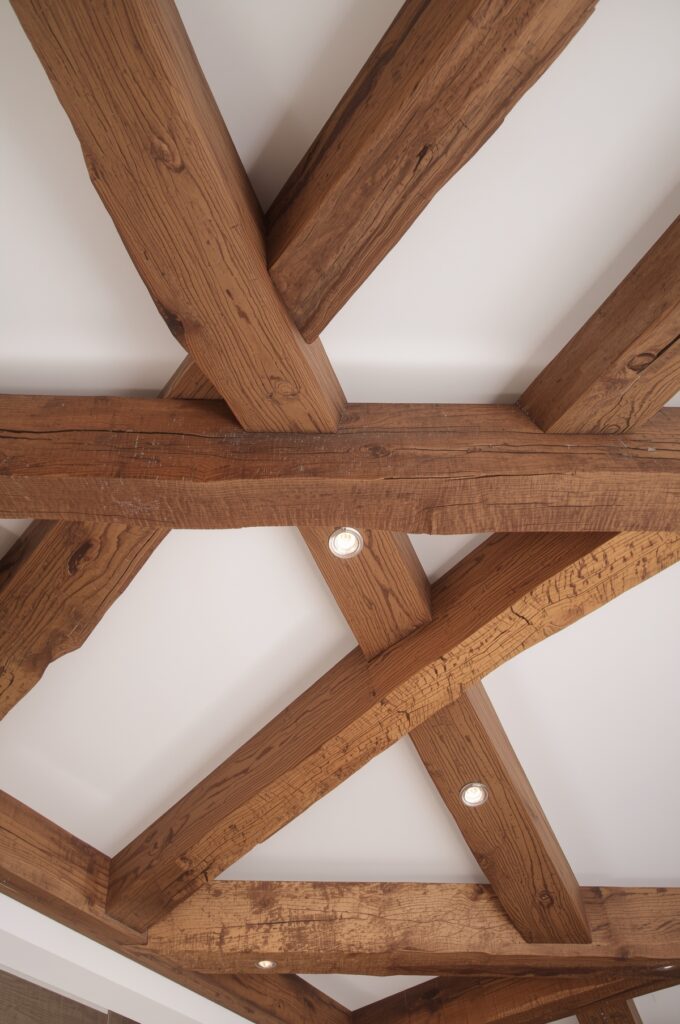 Wooden beams add rustic warmth while maintaining luxury when paired with modern fixtures.