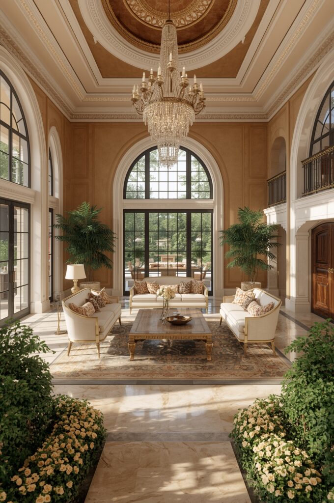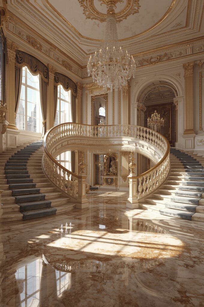 Grand staircases, marble floors, and chandeliers.