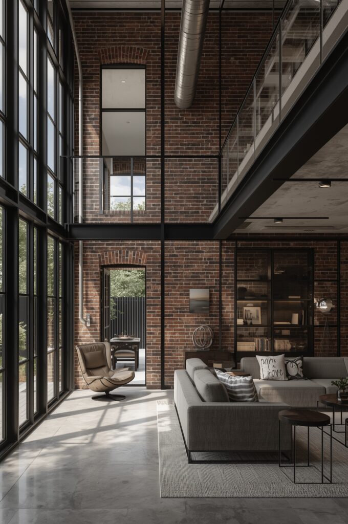 Exposed brick, metal accents, and tall ceilings.