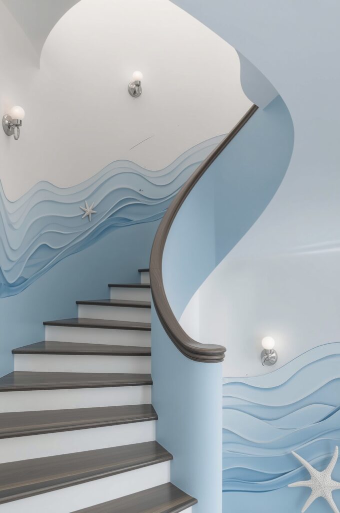 A light, breezy staircase with soft shapes and beachy materials.