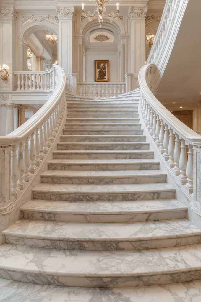 A wide, sweeping staircase made of polished marble.