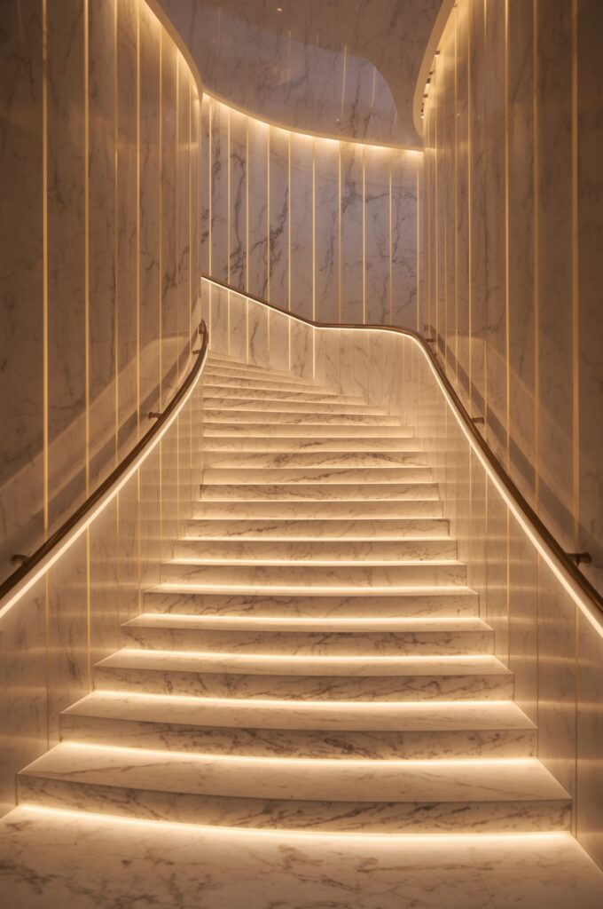 Stairs with built-in lighting along treads or railings.