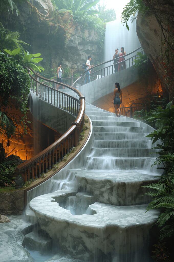 A staircase designed to mimic the cascading movement of water.