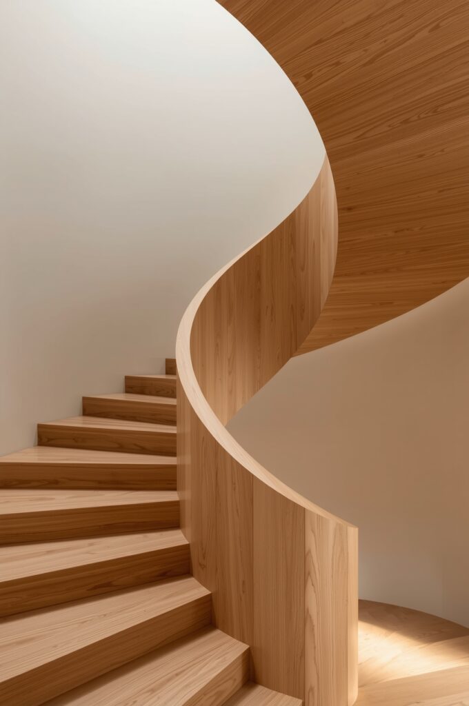 A handcrafted wooden staircase with smooth, flowing lines.
