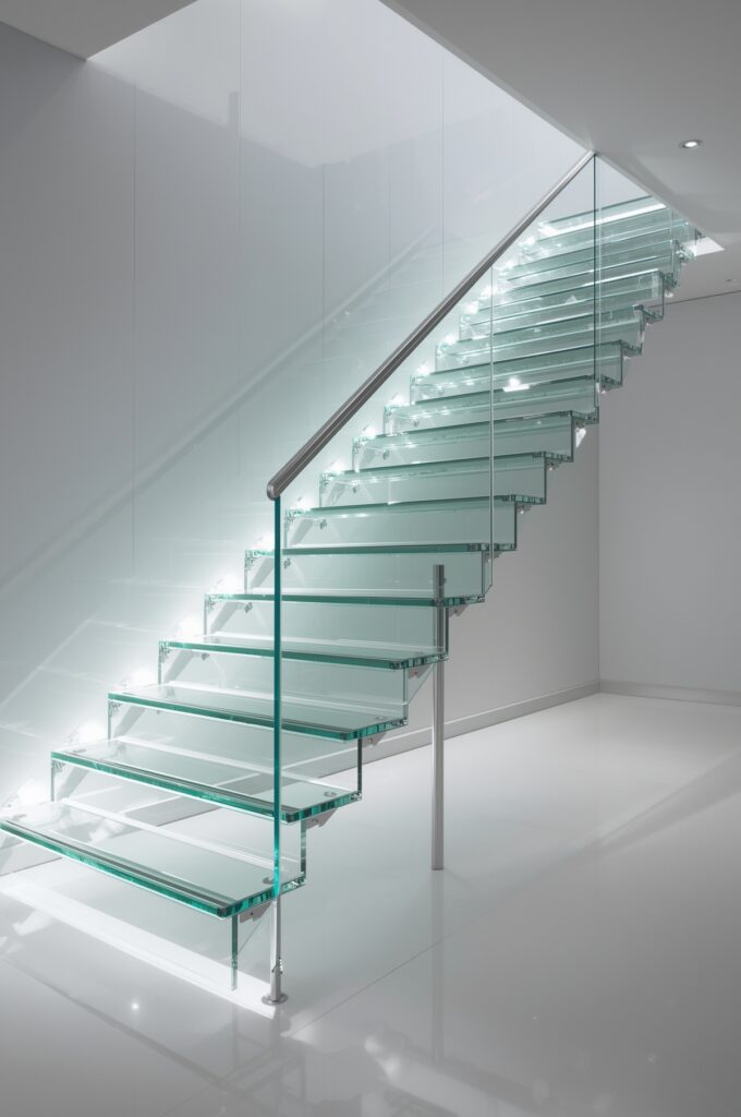 Stairs with transparent glass panels instead of traditional railings.