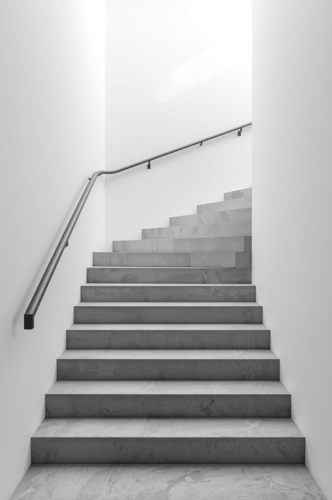 A staircase designed in black-and-white tones with crisp lines.