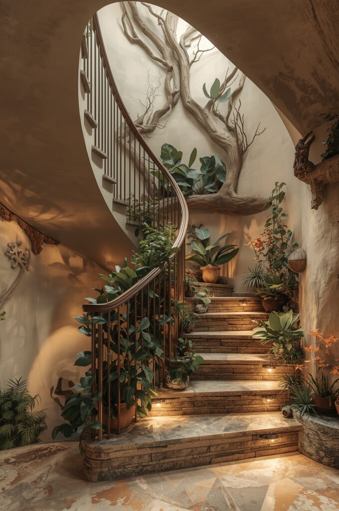 A staircase that uses organic shapes or natural materials like stone and wood.