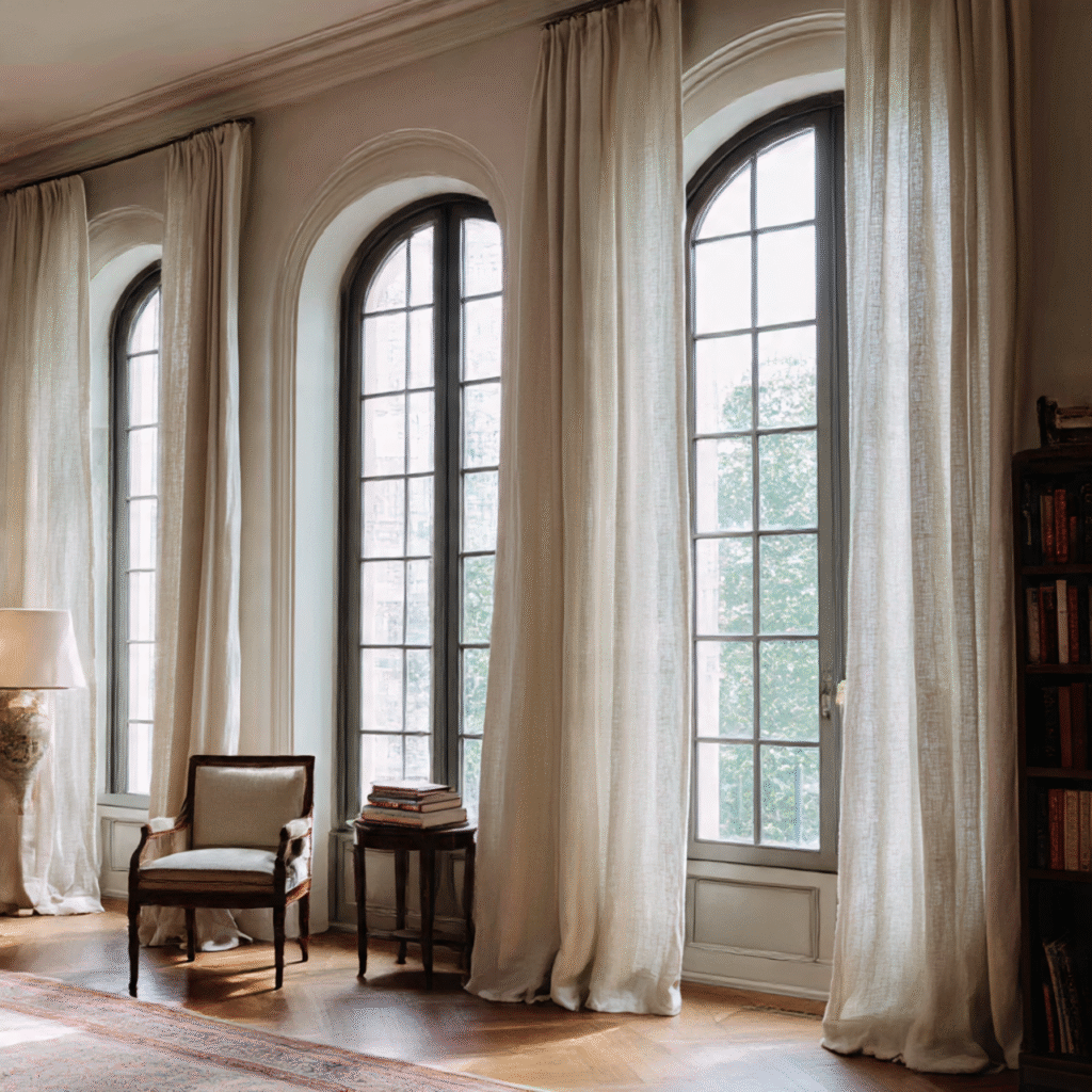 Short curtains can cheapen the look. Always go for floor-length drapes to elongate the room visually.