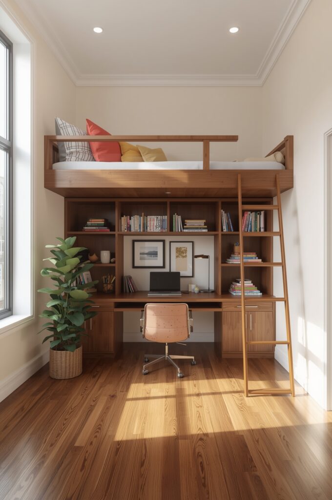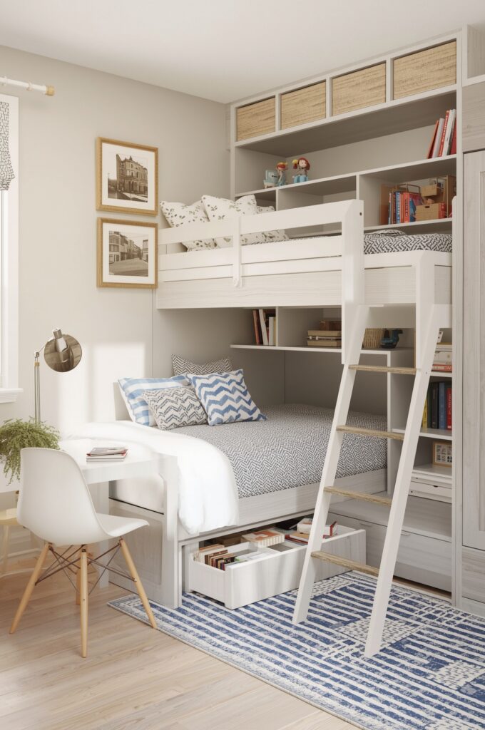 Loft beds with a study area below save space and create a perfect setup for school-aged kids. Pair with ergonomic chairs and open shelves.