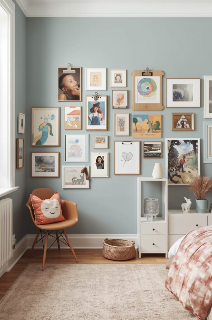 Give kids their own gallery wall where they can display artwork, photos, or crafts. Use frames or clipboards for easy swaps.