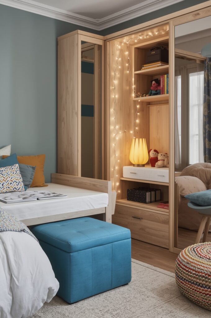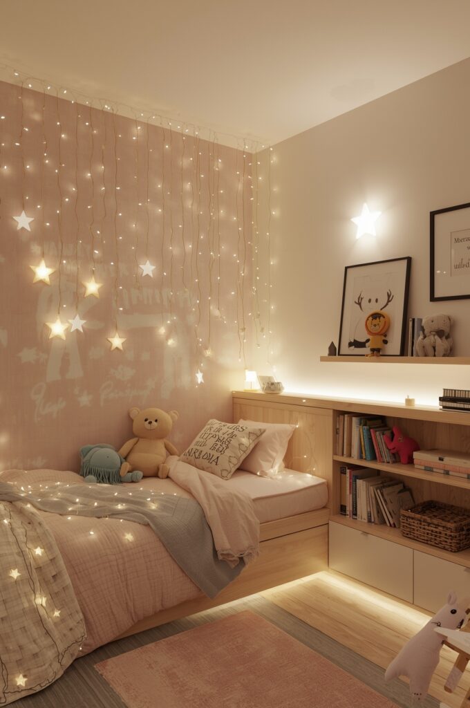 Fairy lights, wall sconces shaped like stars, or LED strip lights under the bed bring a playful yet cozy vibe.