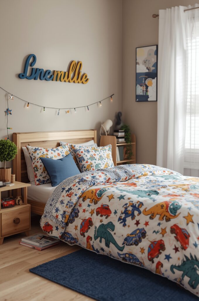 Name signs, custom pillows, or themed bedding tailored to the child’s interests (dinosaurs, stars, cars, etc.) make the space feel personal.