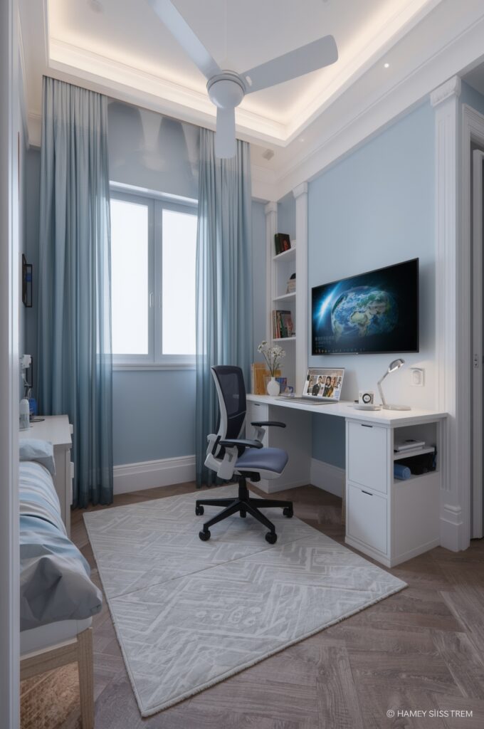 Scandinavian design is loved for its simplicity and elegance. White walls, light wooden furniture, and pops of pastel create a clean yet warm look. This setup encourages focus while leaving space for creativity.