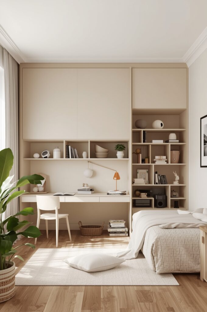 Think beds with pull-out desks, ottomans with hidden storage, or wardrobes with sliding doors.