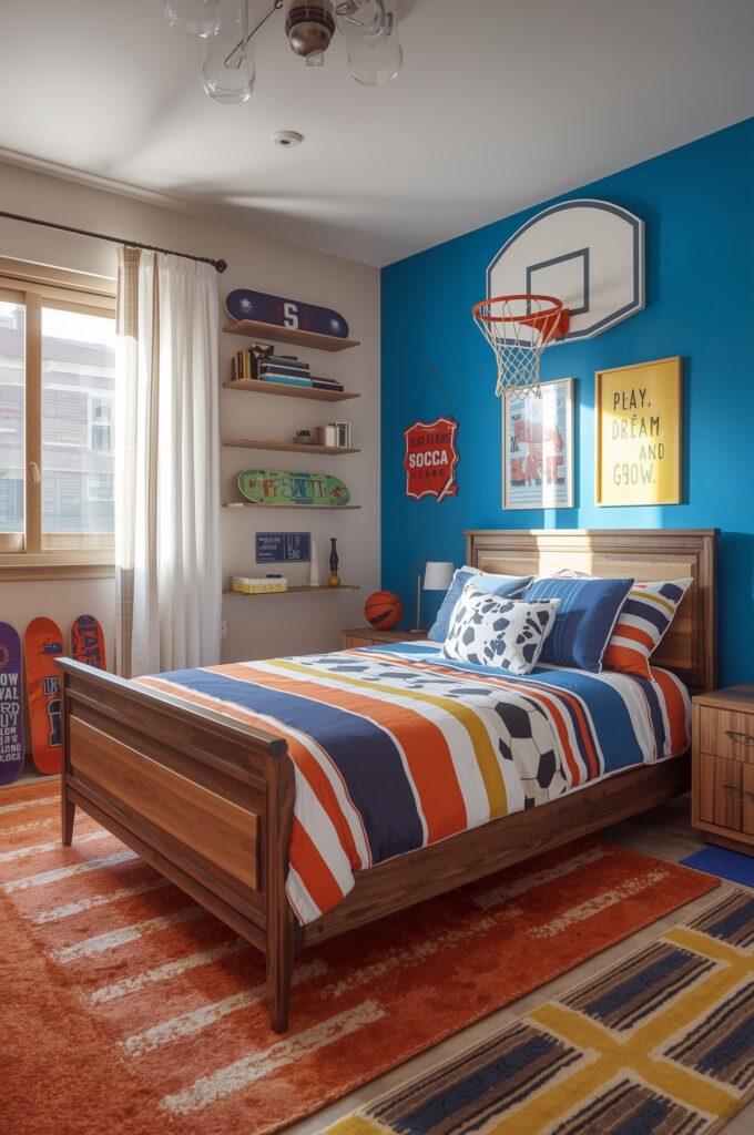 A basketball hoop on the wall, soccer bedding, or skate-themed décor makes the room exciting for sporty kids.