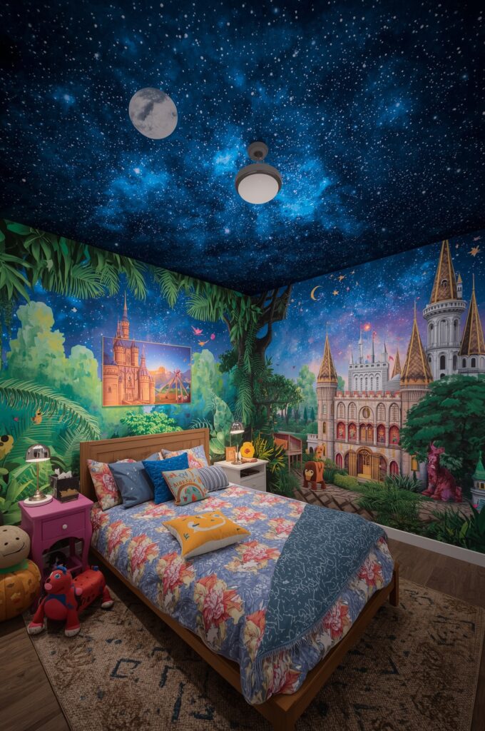 Think space-inspired ceilings, jungle murals, or fairy-tale castles. These immersive designs make kids feel like they’re living in their favorite story.