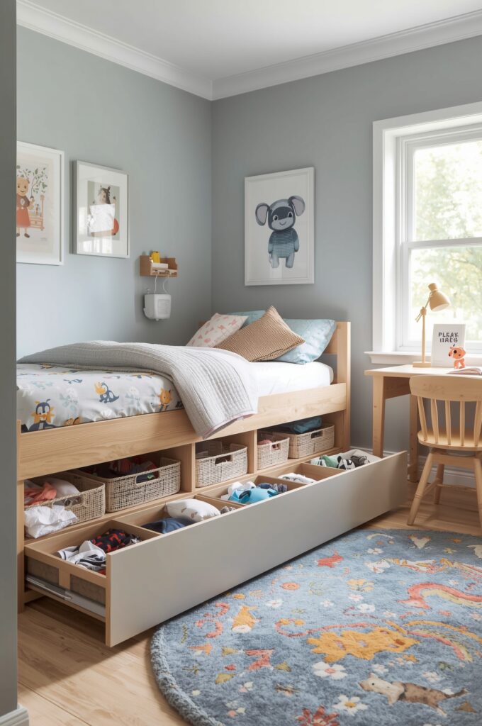 Pull-out drawers or rolling baskets under the bed are perfect for storing toys, clothes, or extra bedding.