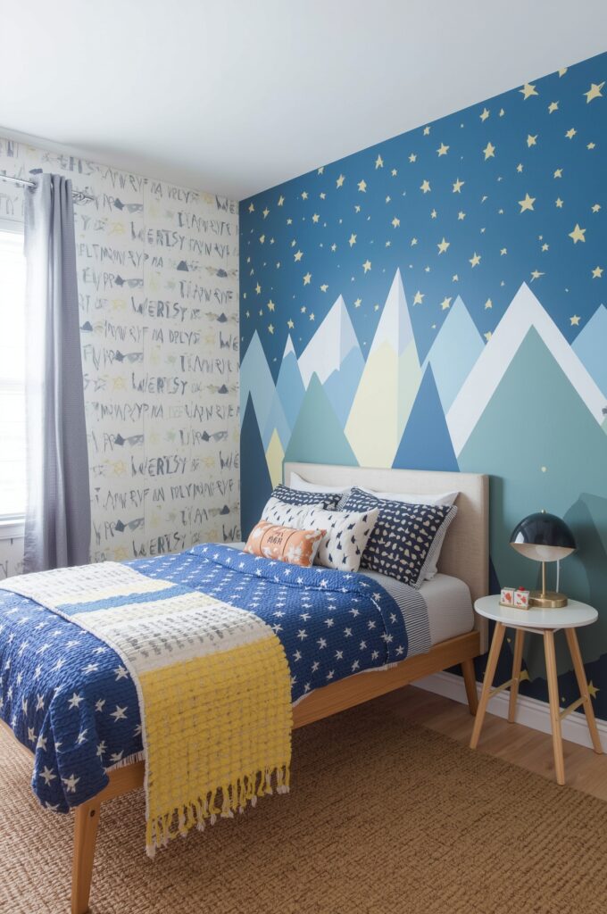 Instead of painting the entire room, try a single accent wall with patterns, murals, or wallpapers featuring stars, mountains, or geometric shapes.