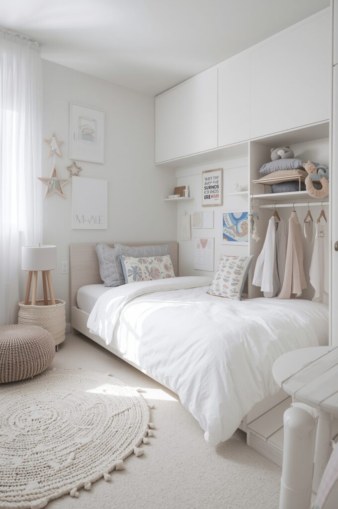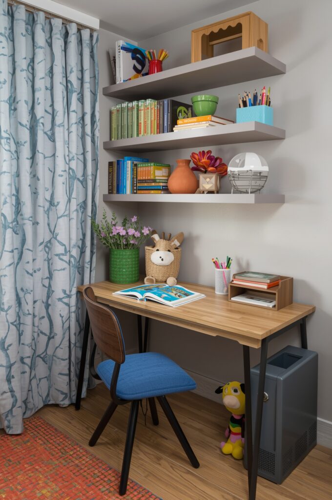 Design a small reading nook or desk area with shelves for books, art supplies, and learning materials. This inspires curiosity while keeping the room organized.