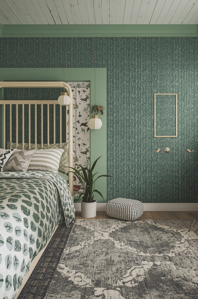 Green walls, leafy wallpapers, and wood details create a natural vibe. Add houseplants (safe, kid-friendly ones) or forest-themed bedding for an earthy touch.
