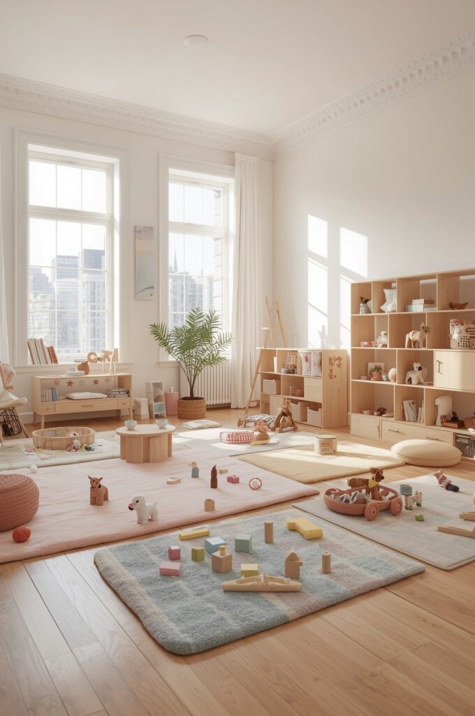 Leave enough floor space for play mats, soft rugs, and toy setups.