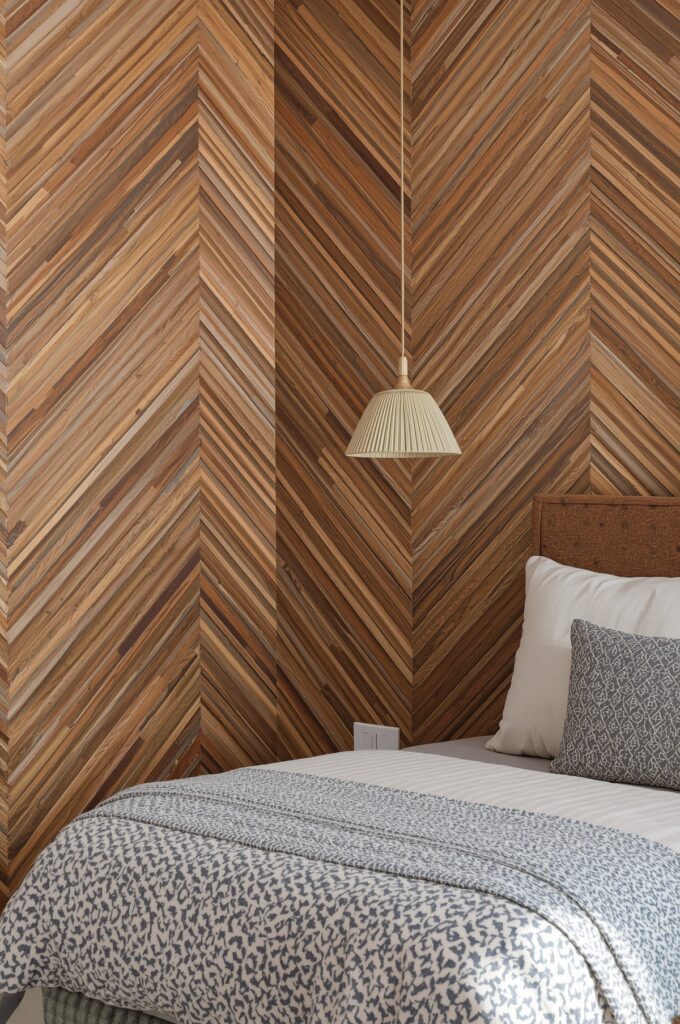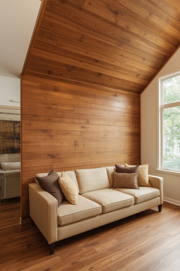 A full wood-paneled accent wall behind a sofa or bed adds texture and becomes a stunning design centerpiece.