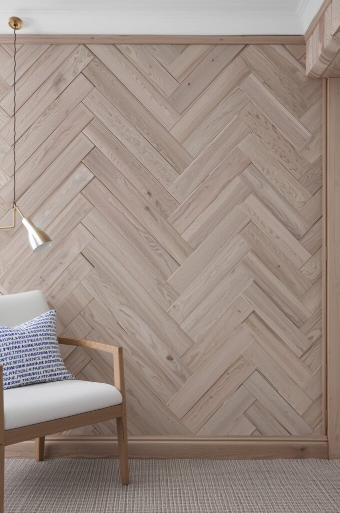 Similar to chevron but more intricate, herringbone wood paneling adds sophistication and timeless appeal—ideal for modern and classic interiors alike.