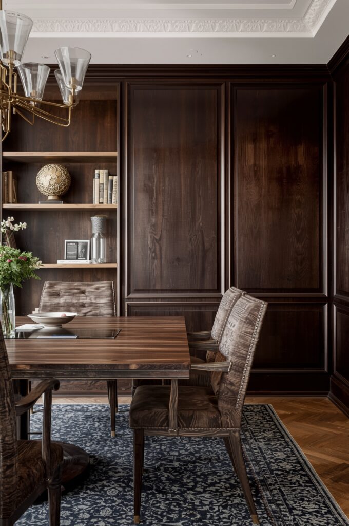 Deep walnut or ebony-stained wood panels create a luxurious, moody atmosphere—perfect for offices, dining rooms, or dramatic living spaces.
