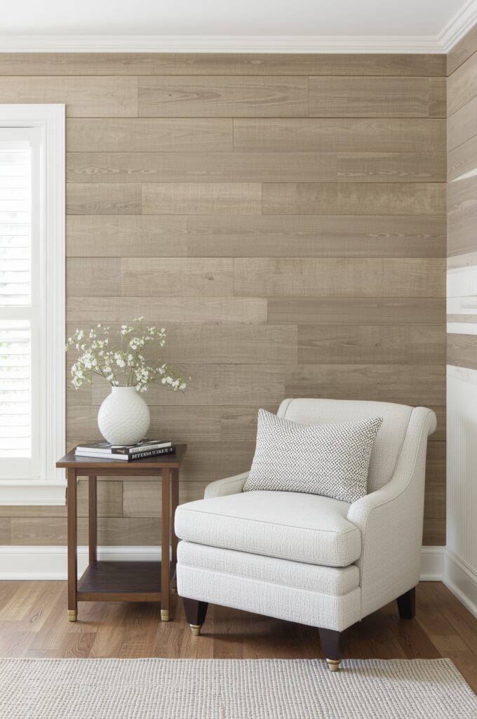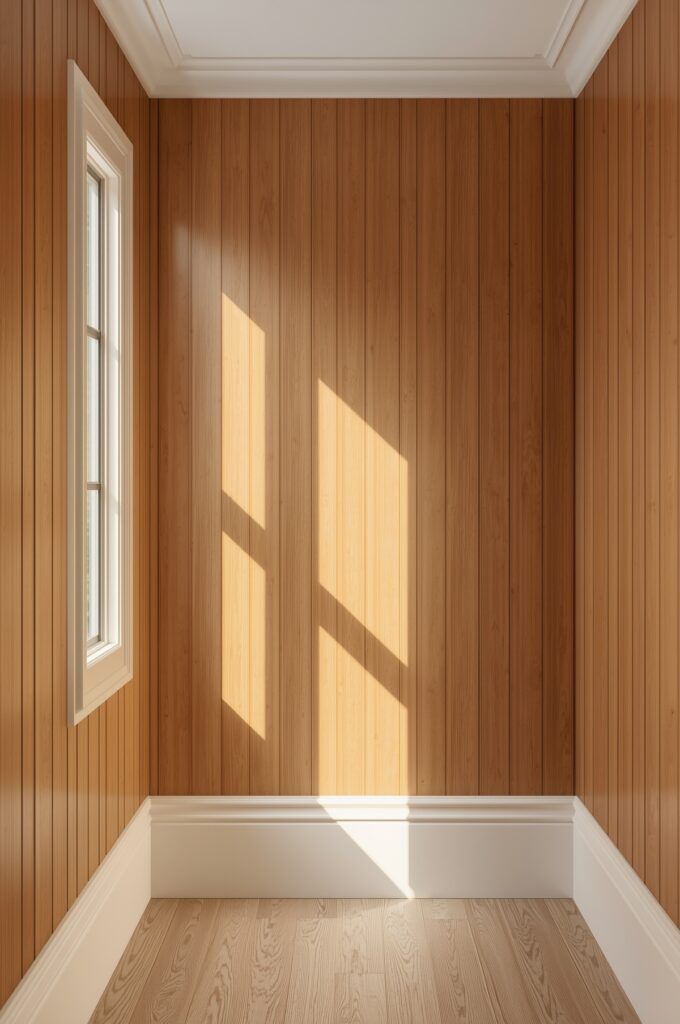 Vertical wood paneling elongates walls, making ceilings feel higher and spaces more refined. It’s perfect for narrow rooms that need an airy, elegant touch.