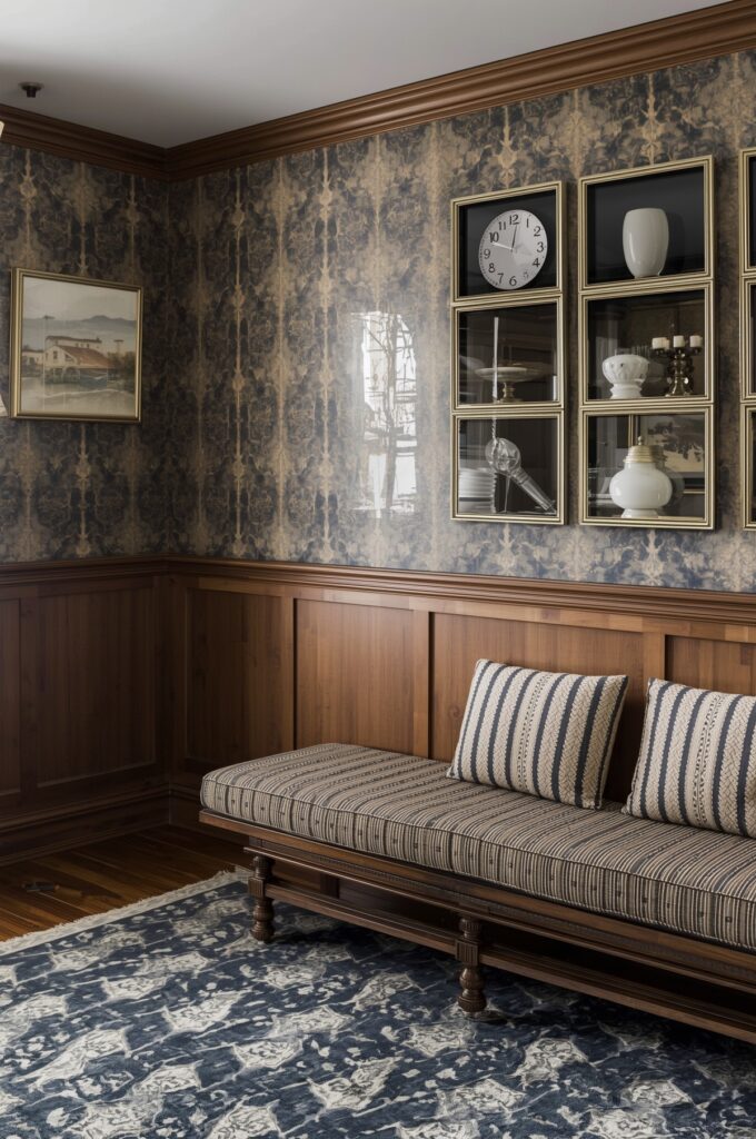 Traditional wainscoting with wood panels on the lower half of walls adds elegance and sophistication to dining rooms, hallways, or living spaces.