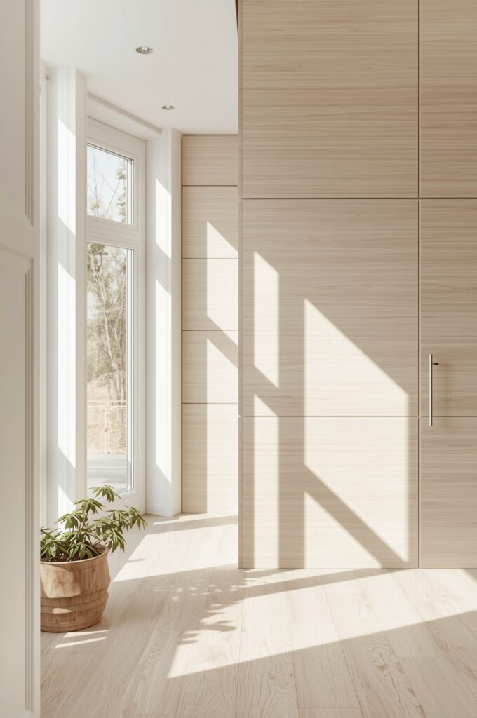 Scandi-inspired light oak or ash panels bring brightness and warmth, perfect for minimalist, airy interiors.