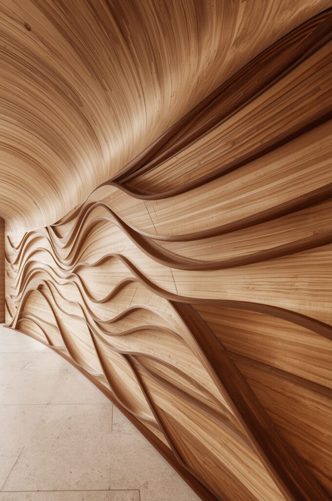 Curved or wave-like wood panel designs are trending in 2025, bringing a futuristic yet organic feel to walls.