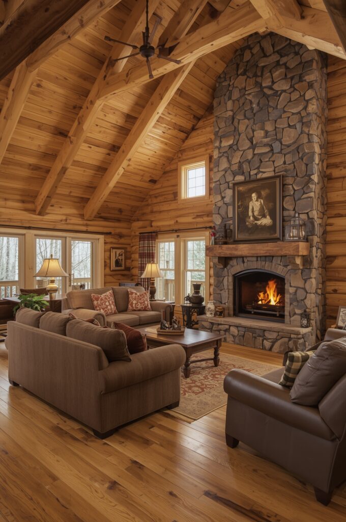 Log-style or thick wooden planks can bring cozy, lodge-inspired warmth to a living room or home office.