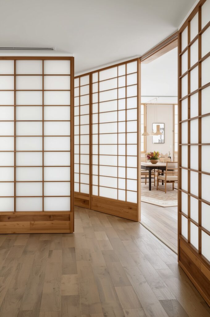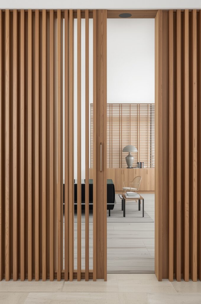 Inspired by traditional Japanese interiors, sleek wooden grids paired with white or neutral walls create serene and balanced spaces.