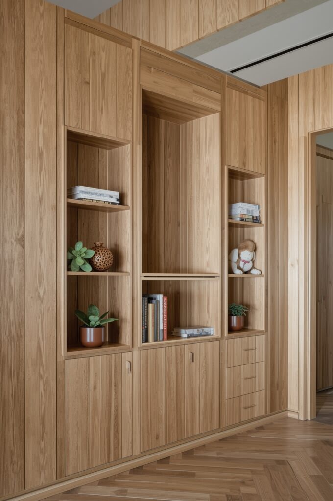 Functional and stylish, some modern wood panel walls include built-in shelving or niches for books, plants, or décor items.