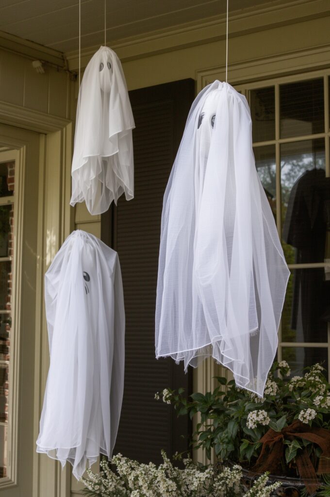 DIY floating ghosts using white fabric over balloons or styrofoam heads. Suspend them from the porch ceiling so they sway in the wind.