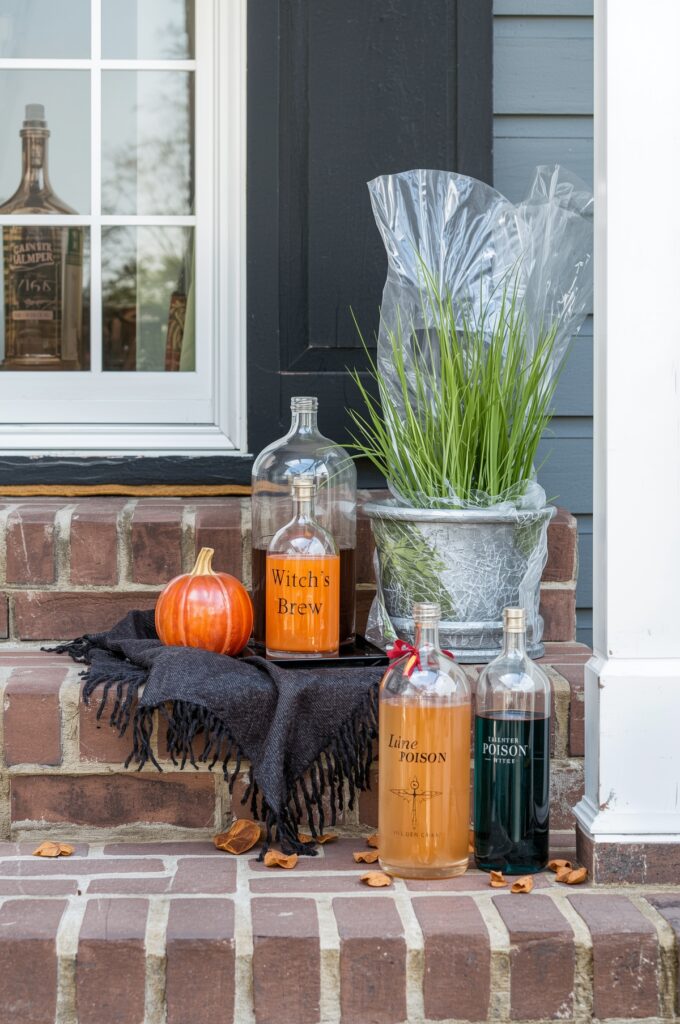 Fill clear bottles with colored water, labels like “Witch’s Brew” or “Poison,” and arrange them on shelves or steps. They’re spooky yet stylish.