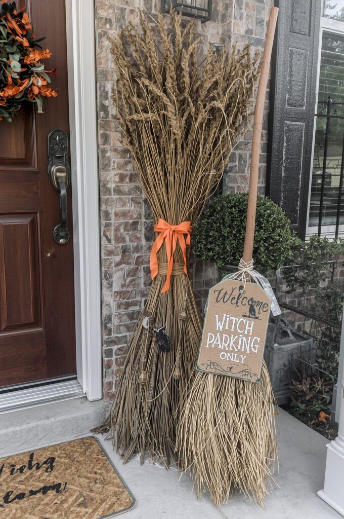 Line up a set of decorative broomsticks with a sign that says “Witch Parking Only” for a playful, spooky touch.