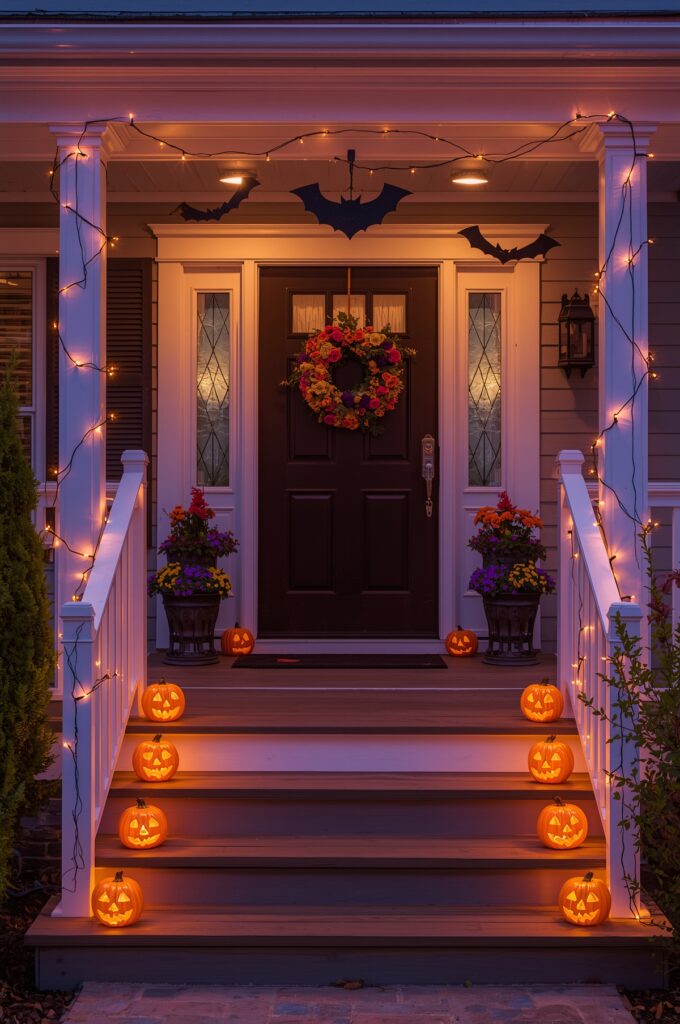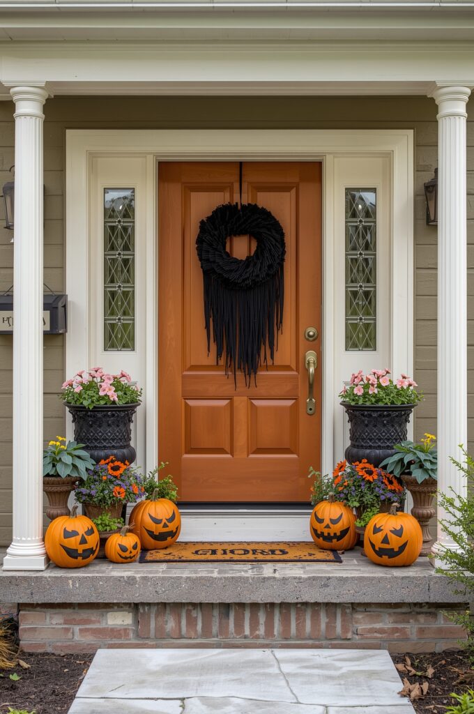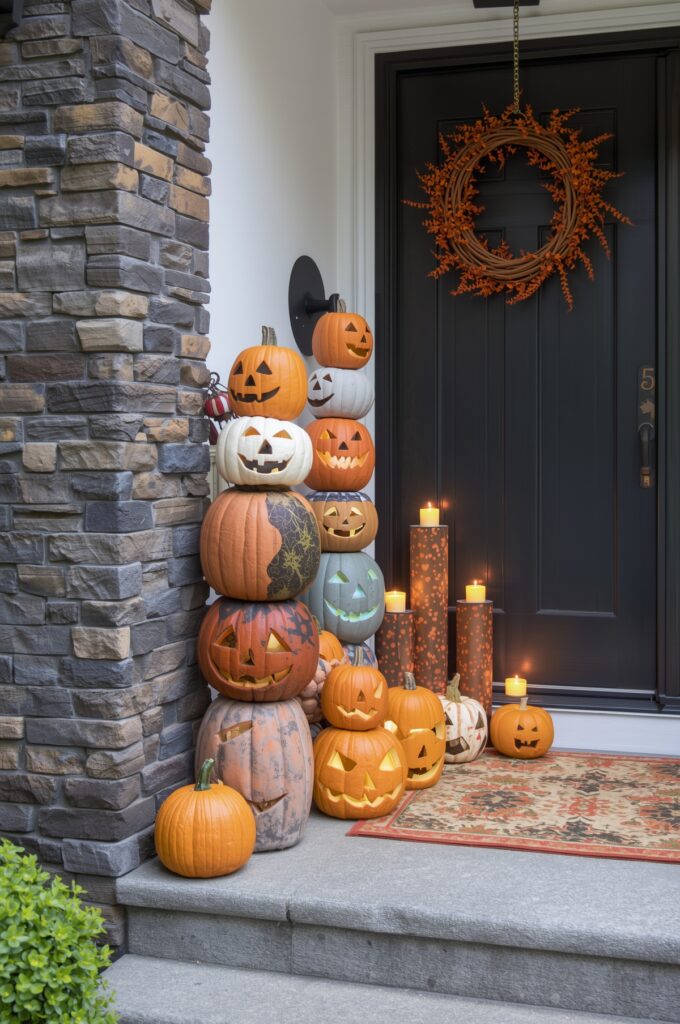 Stack pumpkins of varying sizes—painted, carved, or natural—into towers by your door. Add LED candles for a glowing, dramatic entrance.