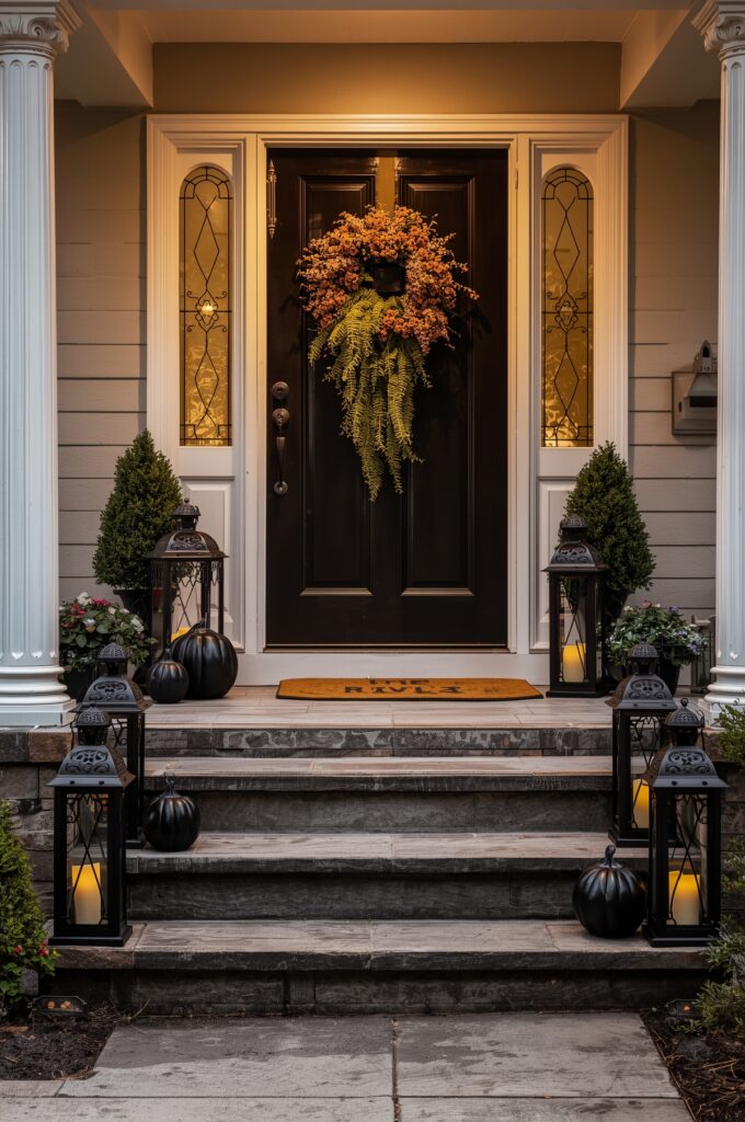 Place black or bronze lanterns with flickering LED candles along steps or around the entryway to create a mysterious glow.
