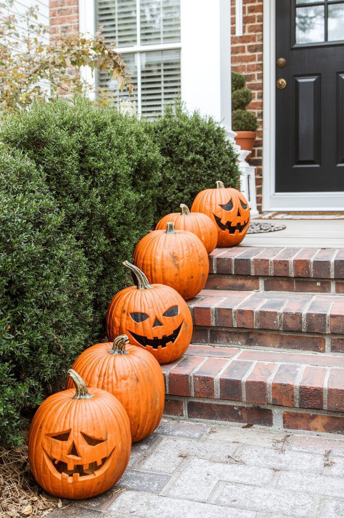 Carve or paint pumpkins and line them up along your walkway. Choose themes—classic scary faces, silly expressions, or elegant designs—for a coordinated look.