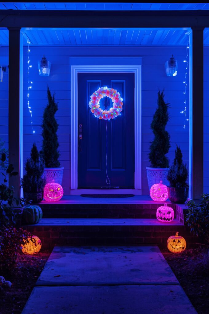 Neon pumpkins, glowing bats, and UV-reactive decorations add futuristic flair and ensure your porch shines even in total darkness.