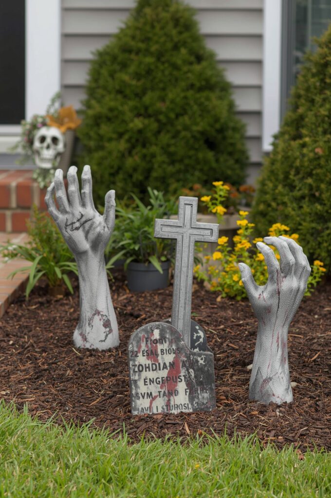 Stick fake zombie hands, bones, or tombstones into your lawn or planters to make it look like creatures are crawling out of the ground.