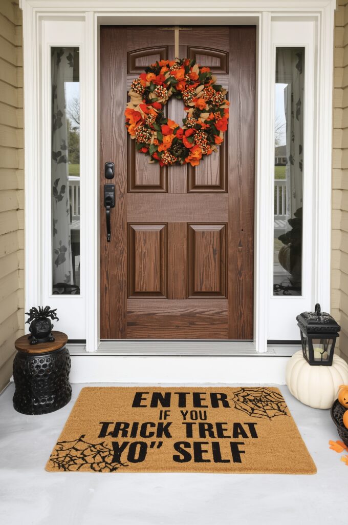 Finish your look with a Halloween-themed mat—options include “Enter if You Dare,” “Trick or Treat Yo’ Self,” or spooky spiderweb prints.